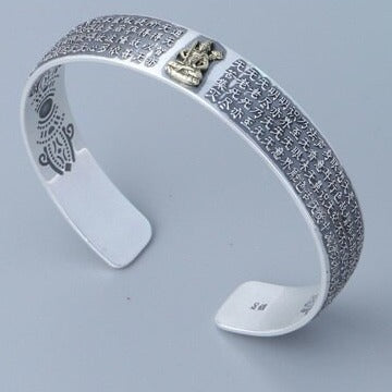 Ce bracelet représente Akasagarbha. Il fait partie des 8 plus grand Bodhisattva du vajrayana. Il est également bouddha au sein de l'école tantrique. Le pourtour du bracelet est sculpté de texte sacré apportant la bonne chance.