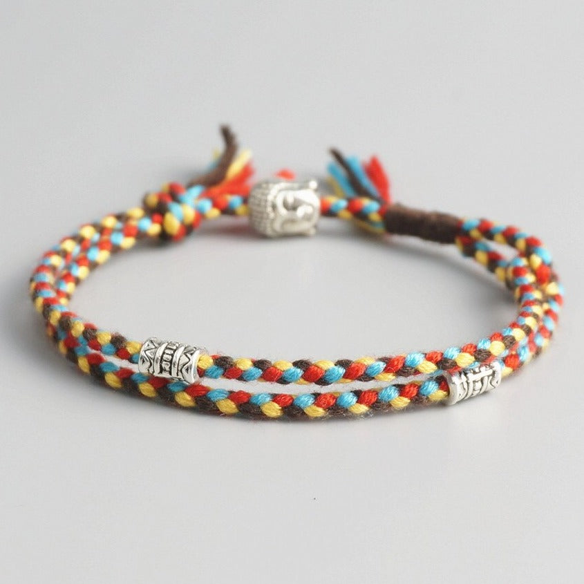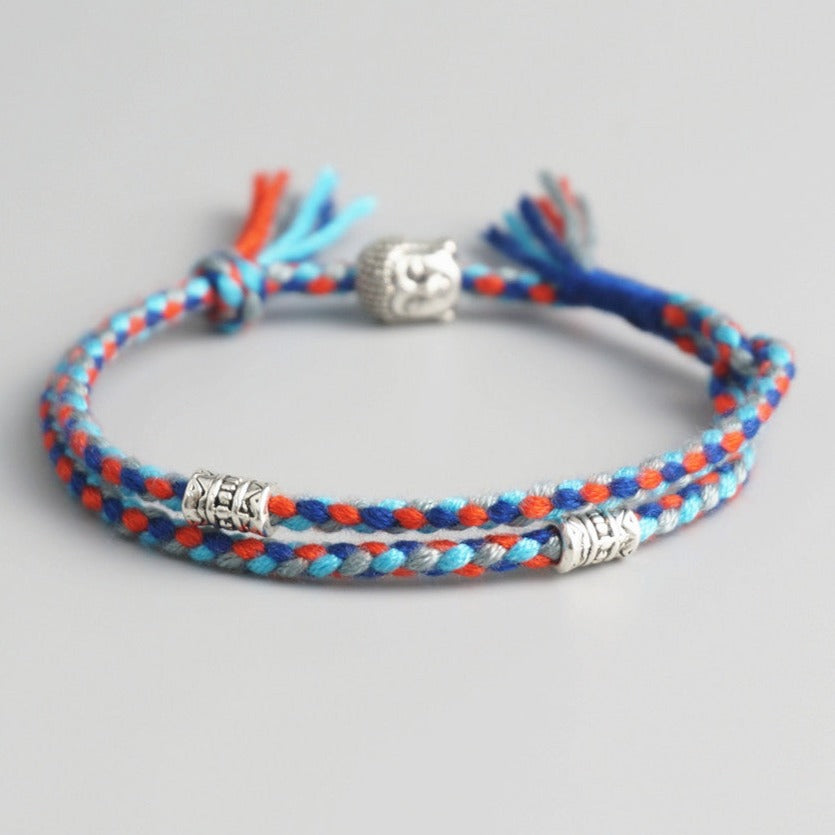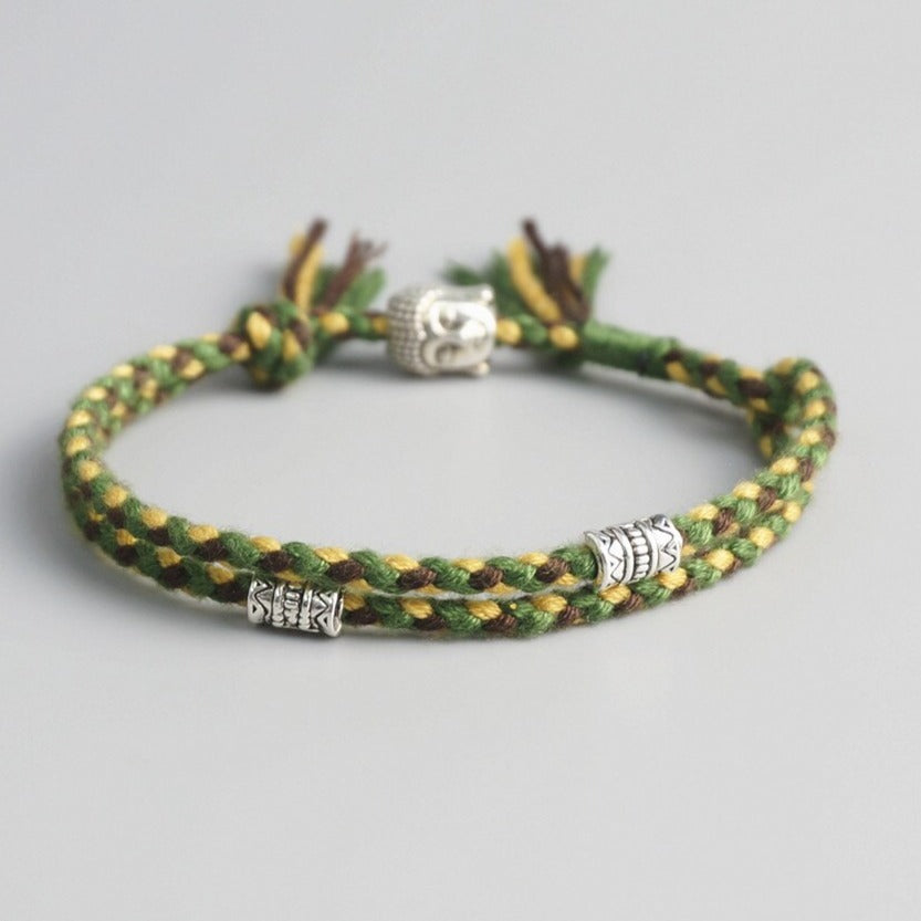Ce bracelet est composé de deux cordes en coton tissé. Les deux cordes représentent les deux énergies dans lesquels le chakra puise : l'énergie terrestre et l'énergie céleste. Le point de contact de ces deux énergies est le chakra du coeur représenté par la tête de Bouddha.