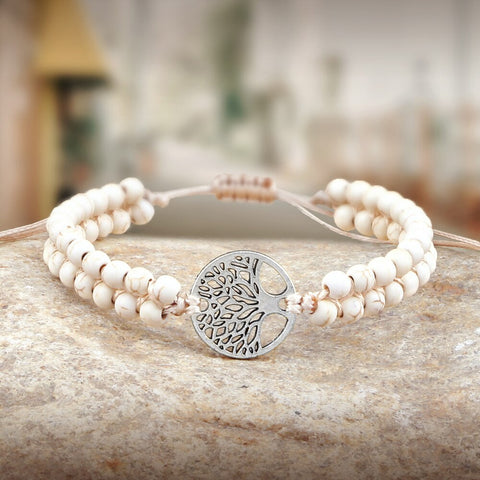 Ce bracelet de yoga est composé de rangées de pierre d'Howlite. Cette pierre est reconnue pour ses vertus contre le stress. L'Howlite harmonise les énergies négatives réduisant leurs impacts sur votre bien-être.