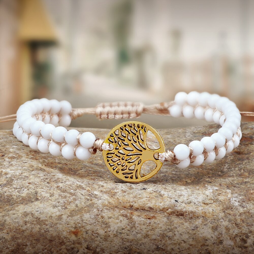 Ce bracelet de yoga est composée de deux rangées de billes en nacre blanc. Suite à un traitment de surface nous l'avons rendu mat pour qu'il s'allie avec n'importe quel style de tenue. Cette pierre est liée au caractère de la personne et permet de l'adoucir.