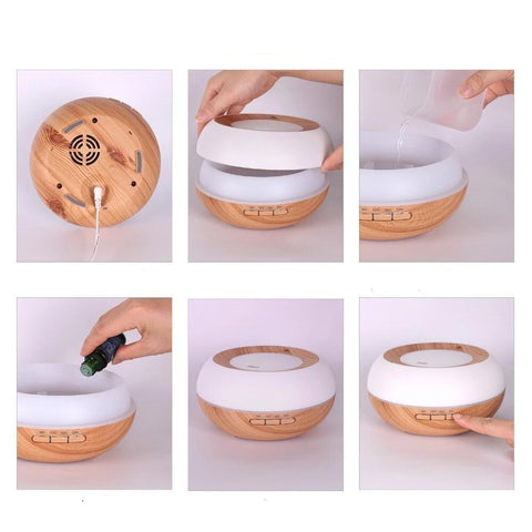• Fonctionnement : Soulevez le couvercle puis remplissez le réservoir d'eau. Ajoutez 3 à 5 gouttes d'huile essentielle. Connectez l'humidificateur à la source d'alimentation et appuyez sur «brume» pour choisir le mode souhaité.