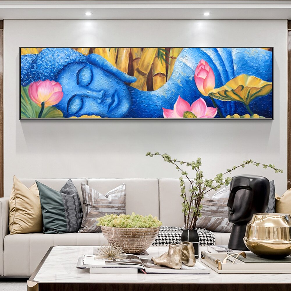 Idéal pour se reposer que d'avoir un Tableau de Bouddha en train de se reposer. Après une longue journée de méditation, de recherche de solutions à de gros problèmes, Bouddha appréciait se reposer seul, ici dans un champ de fleurs selon notre peintre.